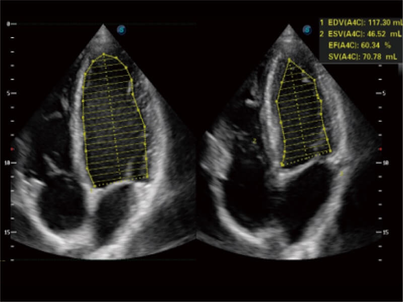 能夠基于左心室壁追蹤和辛普森法,自動計算射血分?jǐn)?shù),支持多個可移動點描跡,與手動測量相比,極大節(jié)省了動物醫(yī)生的時間和精力。