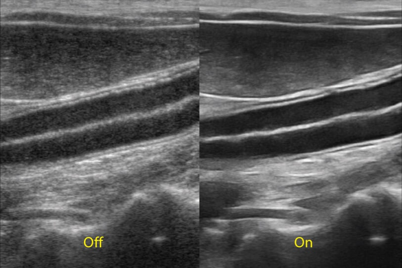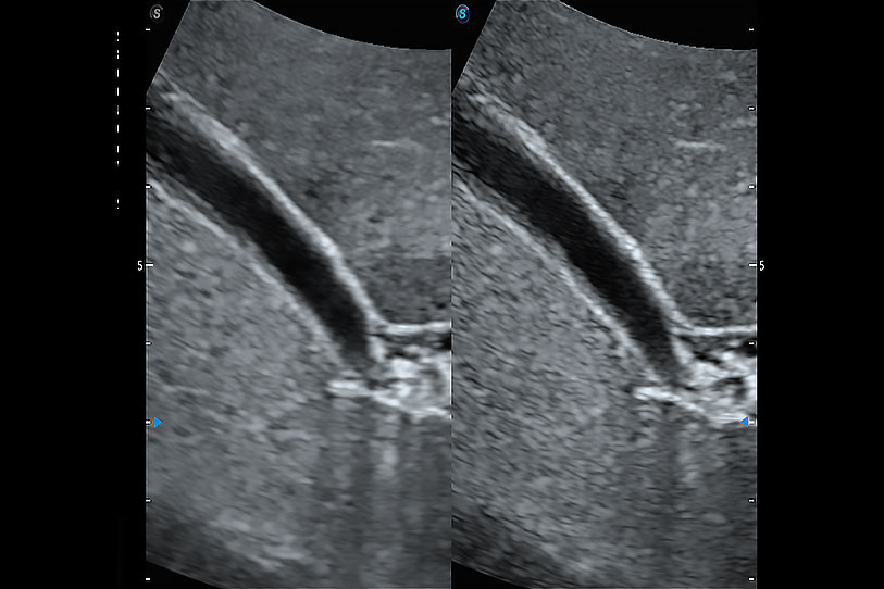 ProPet 70 進(jìn)一步提升了微米成像算法,更加注重對(duì)基礎(chǔ)原始圖像的還原和保留,在有效減少斑點(diǎn)噪聲、增強(qiáng)組織邊界顯示的同時(shí),避免過度優(yōu)化丟失真實(shí)的解剖信息。